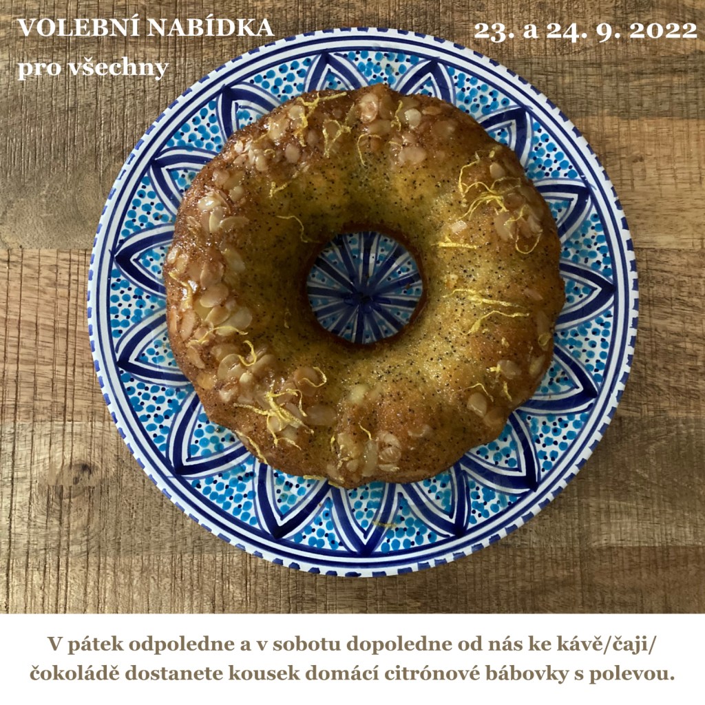 V pátek odpoledne a v sobotu dopoledne od nás ke kávě/čaji/čokoládě dostanete kousek domácí citrónové bábovky s polevou.